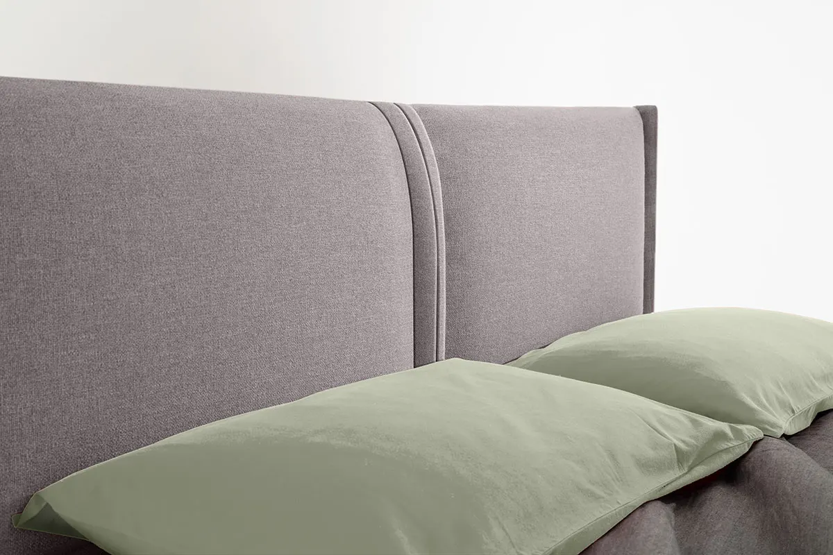 The Venere bed can also be ordered with a storage box, transforming it into a functional piece for storing linens or pillows. The main feature of this bed is the headboard, which boasts a characteristic soft, curved design (known as ‘bombatura‘). The surface is vertically divided into two symmetrical halves that appear to gently touch one another.