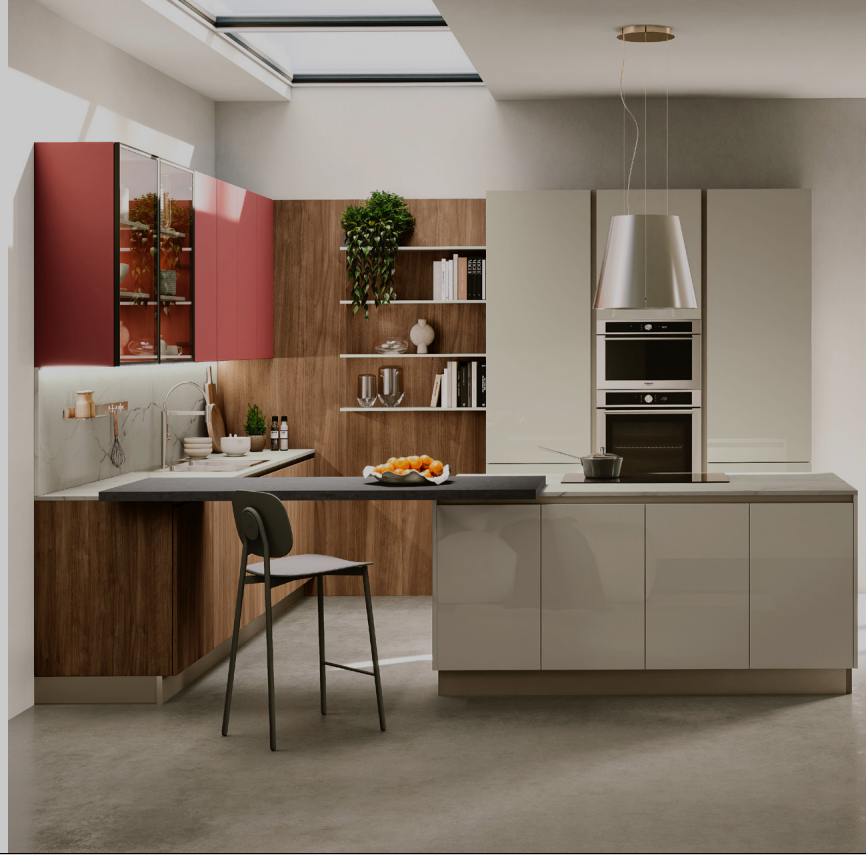 | Material | Glossy lacquered/Wood effect thermostructured/Matt chic melamine/Fumè glass |